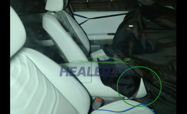 또한, 1열의 중간 센터콘솔 부분은 위장막으로 가렸지만, 앞쪽에 헤드레스트로 추정되는 디자인을 확인할 수 있다.