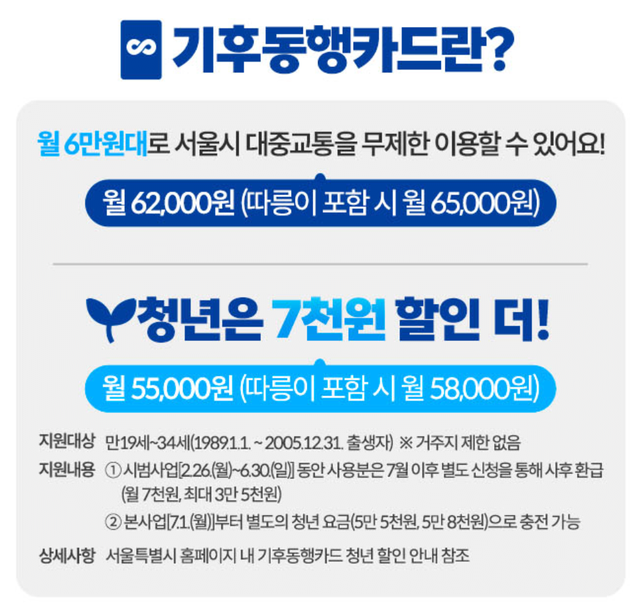 19세~34세 청년 기준이면 7천원 더 쌈! - 즉, 버스+지하철 55,000원 / 따릉이 포함하면 58,000원임