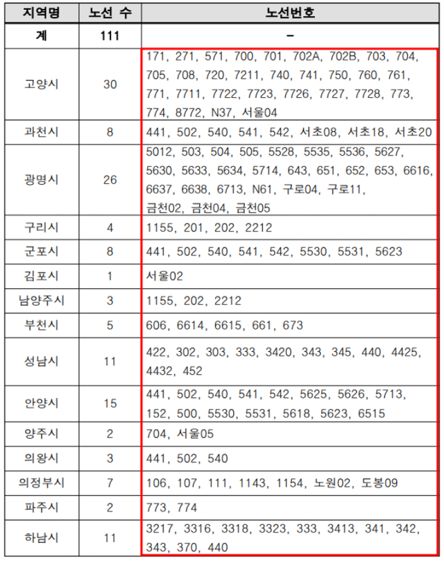 (예를 들어 고양시에서 운행하는 771번, 광명시 505번, 남양주시 202번 등 가능함. 아래표 참고.)