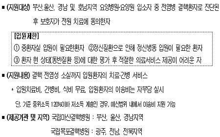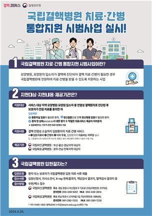 이에, 질병관리청(청장 지영미)과 국립결핵병원은 요양병원과 요양원 결핵환자를 대상으로 전문적인 입원치료 및 간호‧간병통합서비스를 제공하는 시범사업을 다음과 같이 계획, 추진한다.