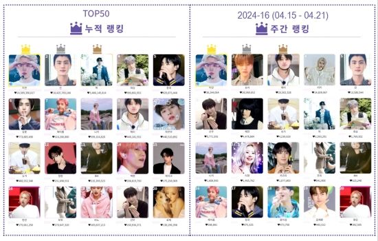 K팝 아이돌 인기투표 앱 '케이돌(KDOL)'에서 방탄소년단(BTS) 지민은 4월 15일부터 4월 21일까지 주간 랭킹에서 3,824만 4,064표를 얻어 1위를 차지했다.