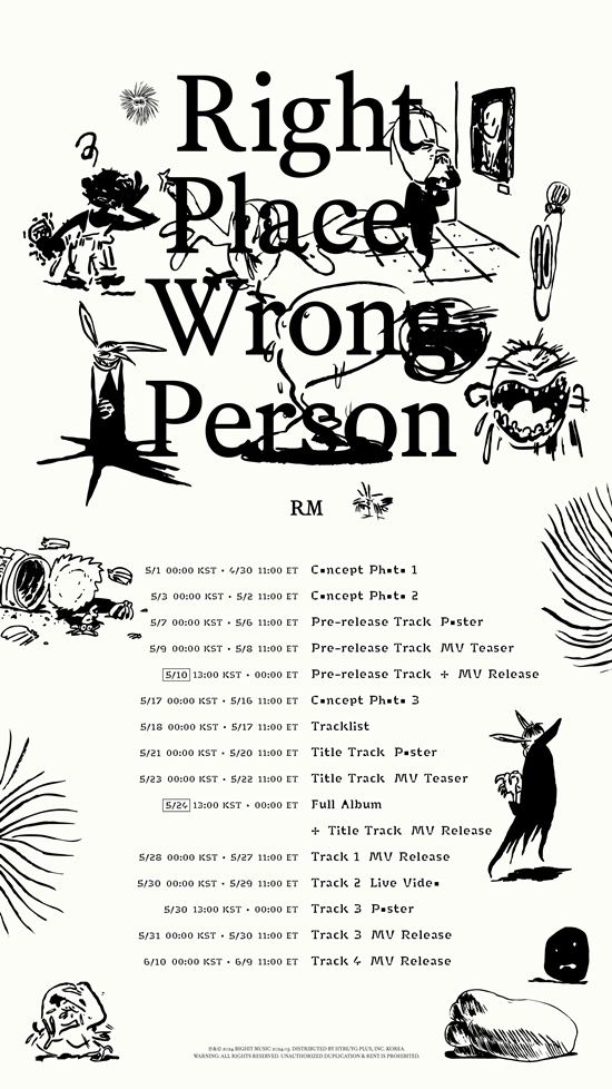 그리고 5월 24일 오후 1시 RM의 신보 'Right Place, Wrong Person' 전곡 음원과 타이틀곡 뮤직비디오가 공개된다.
