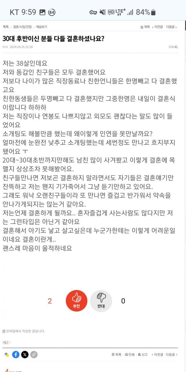 결혼/시집/친정 : 저는 38살인데요 저와 동갑인 친구들은 모두 결혼했어요 저보다 나이가 많은 직장동료나 친한언니들은 한명빼고 다 결혼했고요 친한동생들은 두명빼고 다 결혼했지만 그중한명은 내일이...