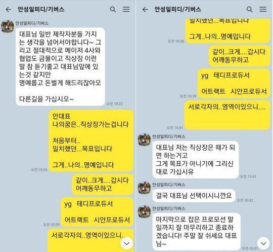 당초 전 대표는 더기버스 안성일 프로듀서의 ‘레이블 딜’ 제안에 대해, 회사를 팔지 않고 선급금 투자 방식으로 진행하며 “직상장가는 것이 나의 목표이자 명예”라는 입장을 분명히 했다. 이는 두 사람이 지난 4월22일 주고받은 문자메시지(사진1)를 통해서도 확인된다.
