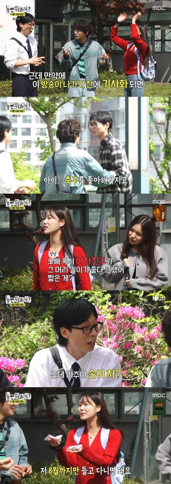 또한 이미주는 "날씨가 좋다"고 활기차게 이야기하며 4월에도 핫팩을 드는 모습을 보여 웃음을 자아냈다. 유재석은 "손이 차냐"고 물었고 이미주는 "8월까지만 들고 다니겠다"고 너스레를 떨었다.