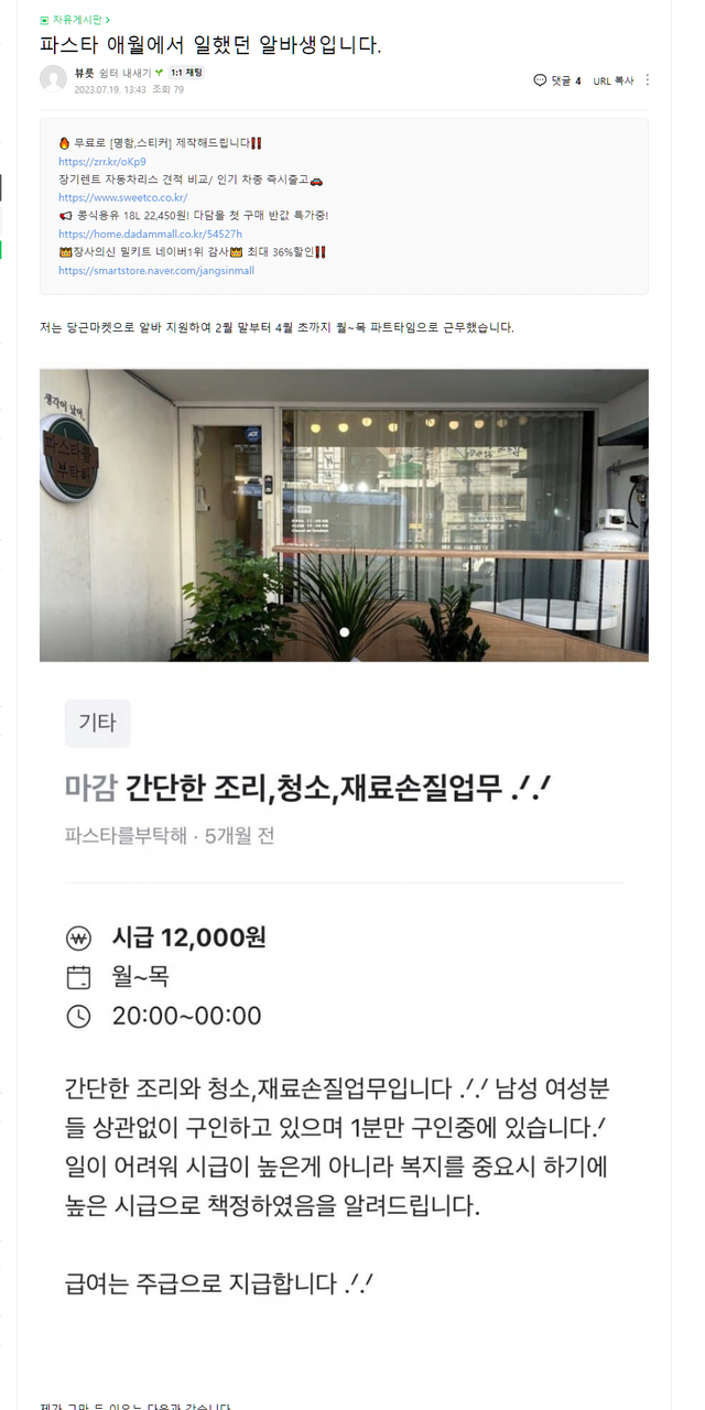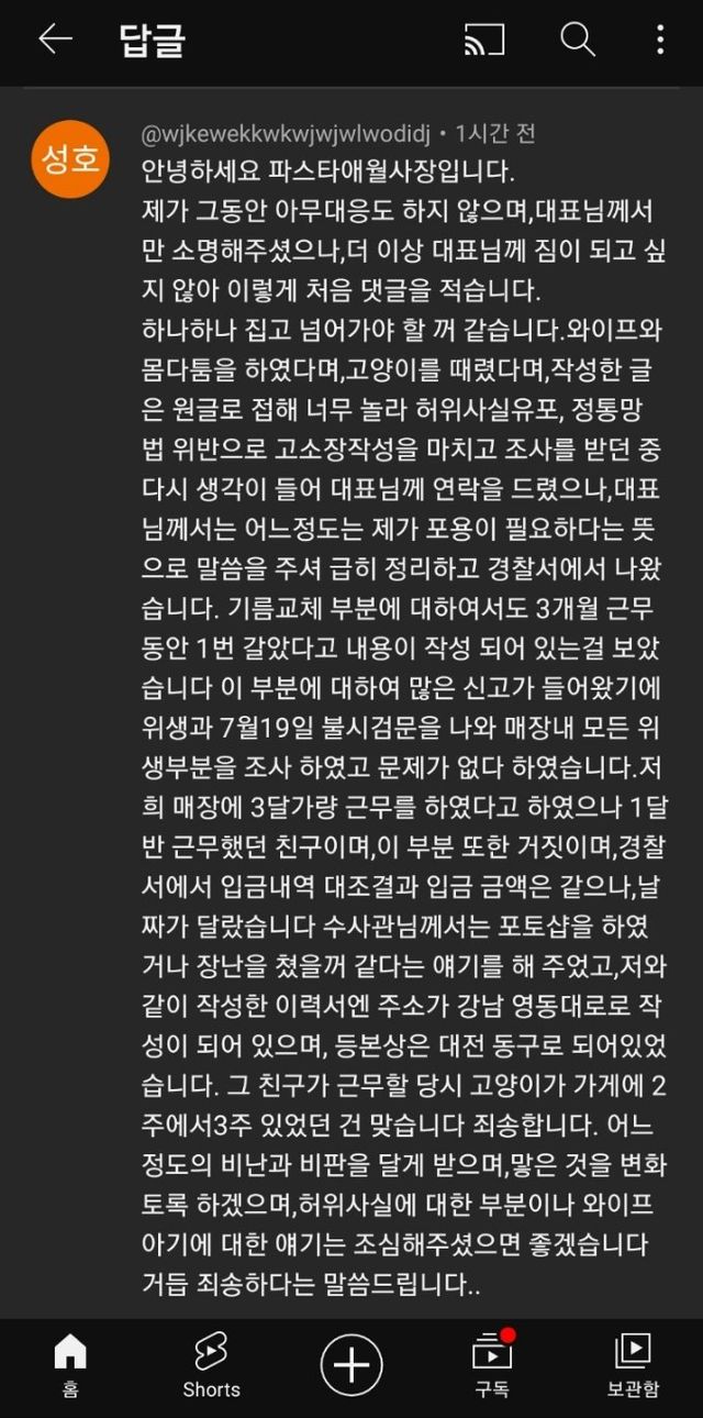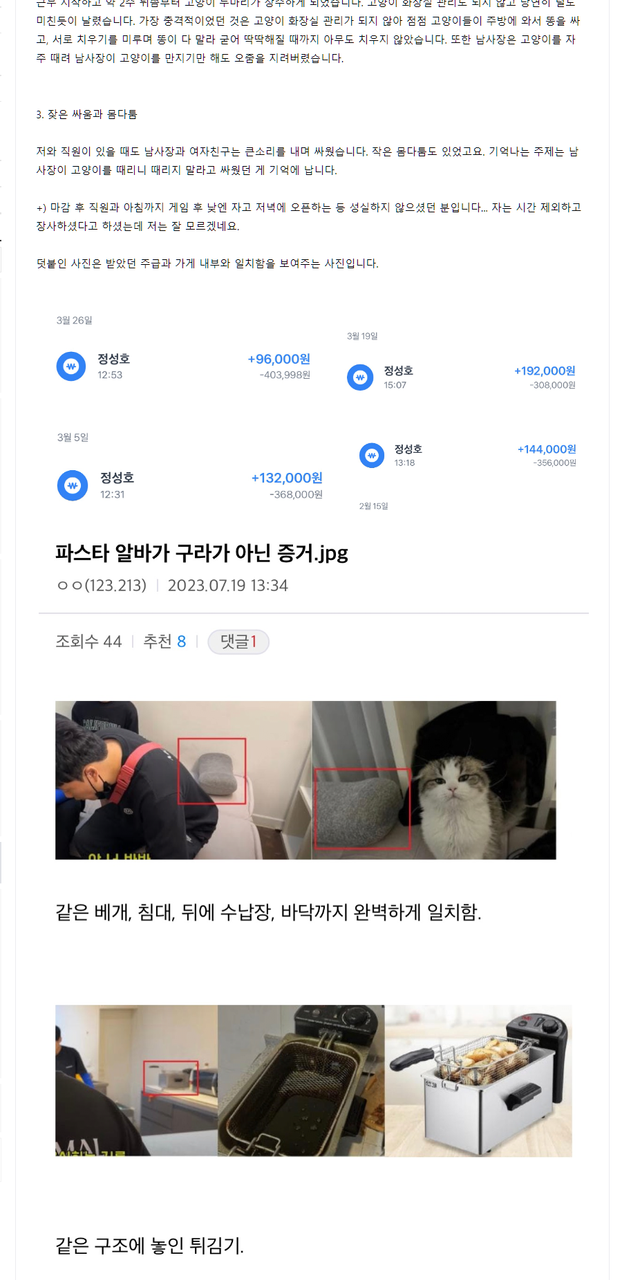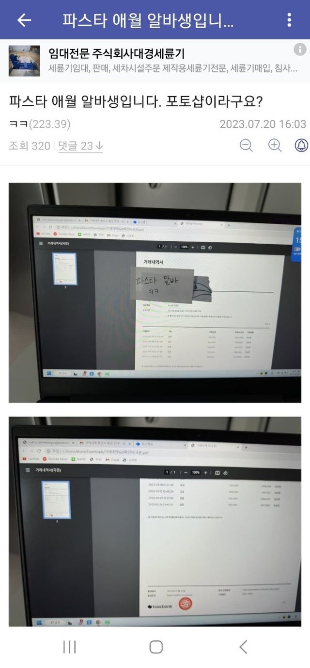 상황 요약:예전에 애월파스타집에서 일했던 알바생이 내부폭로함,그후로 애월파스타집 사장이 댓글로 허위사실유포,거래내역 포토샵으로 장난쳤다라고 해명댓글을 달았음,알바생이 바로 거래내역서 인증해서 올림>>애월파스타집 사장 글삭튀