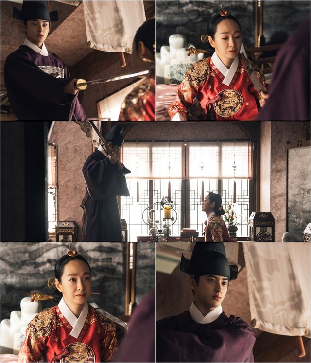 이와 관련 명세빈과 김민규가 궁궐을 발칵 뒤집은 ‘이유 있는 저격’ 현장으로 더욱 깊어진 갈등을 드러낸다. 극 중 도성대군이 대비 민수련을 찾아와 장검을 뽑아 들고 겨누는 장면. 신하들을 뿌리치며 달려온 도성대군은 단숨에 민수련의 목에 칼날을 들이밀지만, 민수련은 칼날 앞에서도 요지부동 자세와 뻔뻔한 눈빛으로 도성대군의 분노를 돋운다.