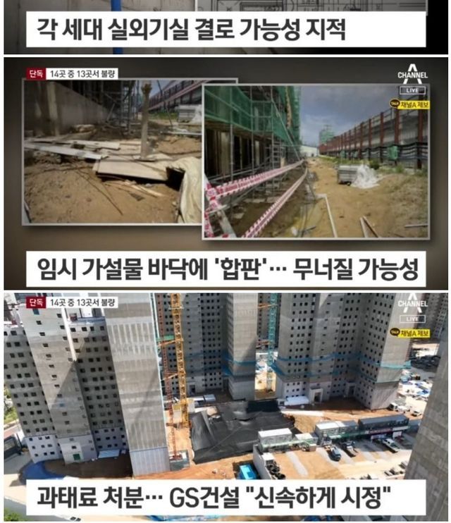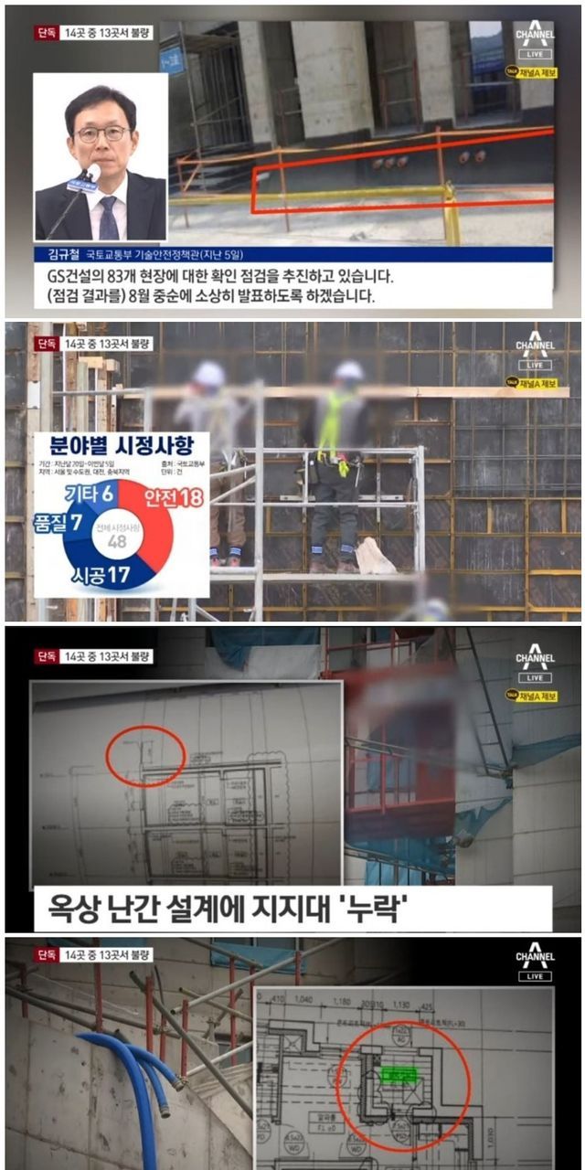 1. 정부가 GS건설이 시공 중인 전국 건설현장 83곳에 대해 전수조사를 벌이고 있는데, 점검이 끝난 14곳 중 13곳에서 시공 불량과 안전 관리 문제가 무더기로 적발