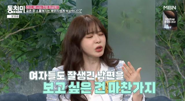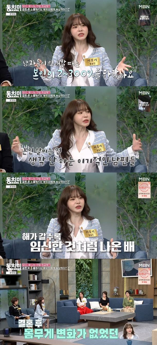 김현욱은 "그러면 행복한 거 아니냐"고 물었지만 서유리는 "그걸 행복하다고 포장하면 안 된다. 보고 있는 저는 괴롭다. 여자들도 잘생긴 남편을 보고 싶다. 남자들이 여자한테 '결혼하고 살찌지 말라' 하지 않냐"고 불만을 토로했다.