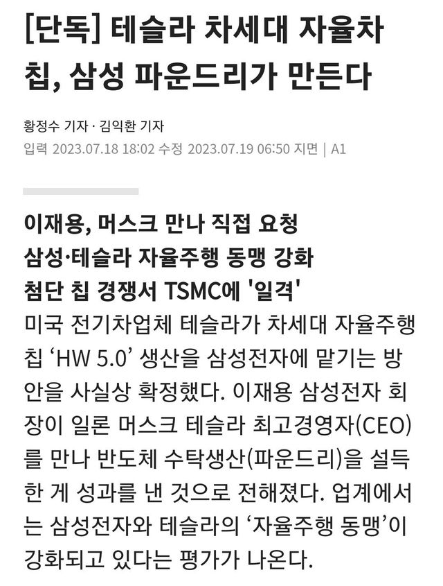두 회사 계약에 정통한 복수의 관계자는 “테슬라가 이 회장의 제안을 받아들이기로 했다”며 “삼성, TSMC를 복수 공급사로 선정하는 방안과 삼성에 100% 위탁하는 안을 놓고 고심 중”이라고 전했다