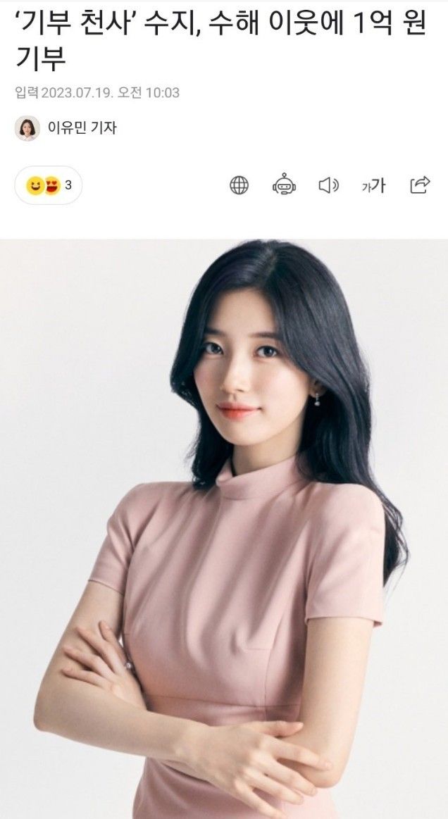 배우 수지가 수해 이웃을 돕기 위해 선한 영향력을 행사했다.