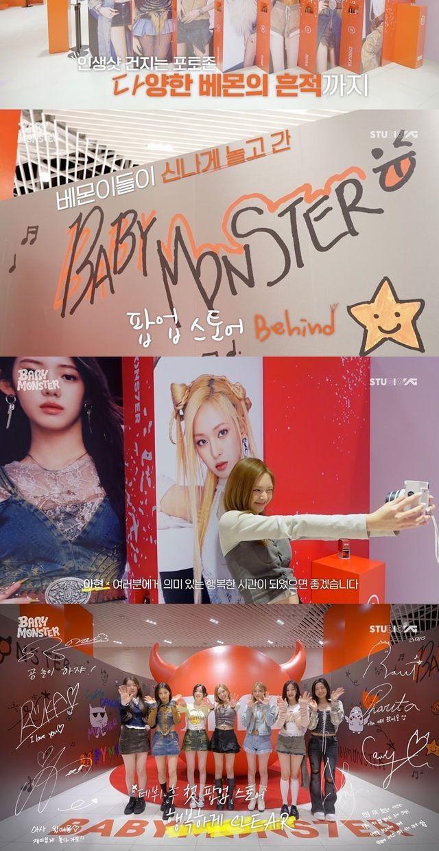 YG엔터테인먼트는 지난 27일 공식 블로그에 'BABYMONSTER - 1st MINI ALBUM [BABYMONS7ER] POP-UP STORE BEHIND'를 게재했다. 공식 데뷔 기념 더현대 서울 이벤트 플라자에서 진행된 팝업스토어를 직접 찾은 멤버들의 모습이 담겼다.