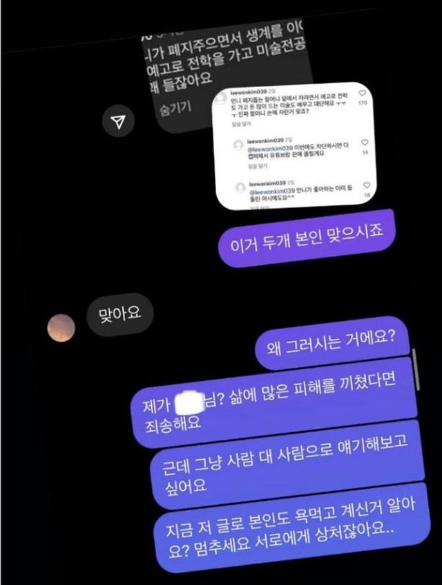 공개한 메시지에 따르면 네티즌 A씨는 한소희 인스타그램에 '언니 폐지 줍는 할머니 밑에서 자라면서 예고로 전학도 가고 돈 많이 드는 미술도 배우고 대단해요. 진짜 할머니 손에 자란 거 맞죠?', '이번에도 차단하면 다 캡처해서 유튜브 올리겠다' 등의 댓글을 달았다.