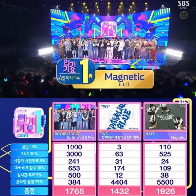 아일릿은 온라인 음언 부분에서 5500점이나 높은 점수를 얻으며 총 6306점으로 1위를 차지했다. 2위는 보이넥스트도어(5778점), 3위는 투어스(4687점) 순이다. 이날 아일릿은 음악방송에 참여하지 않았다. 이에 3 MC들은 “일 위 트로피는 꼭 아일릿 분들에게 전해주겠다”며 대신 감사 인사를 전했다.