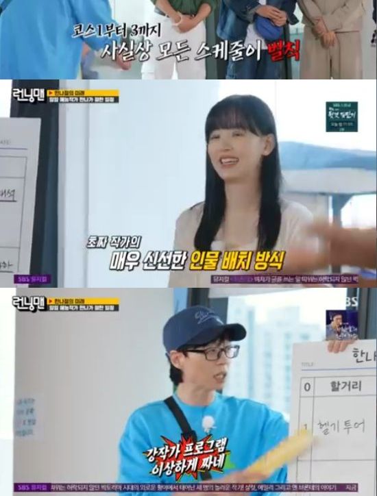 강한나가 준비한 첫 번째 코스는 '헬기투어'였고, 수행할 사람은 강한나, 유재석, 하하였다. '런닝맨' 대표 겁쟁이 유재석과 하하는 질색하면서 "강작가, 왜 그러는거야. 진짜 최악"이라고 질색했다.