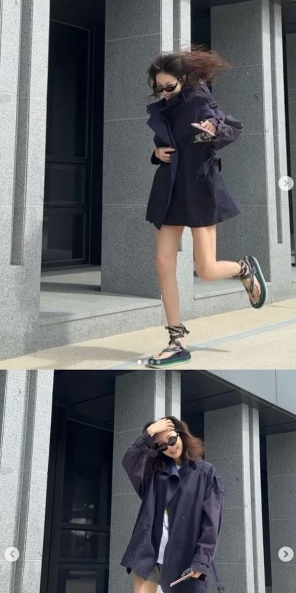 사진 속에서 이지아는 네이비 컬러의 재킷을 걸친 팬츠리스 패션을 선보이며 눈길을 사로잡았다.