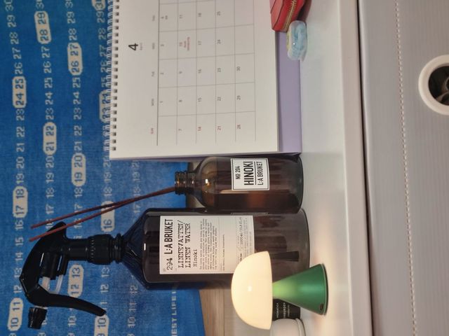 빨강과 주황 사이 은은한 컬러를 자랑하는 고급스러운 글라스 보틀과 천연 리드 스틱으로 구성된 룸 디퓨저. 유리병의 뚜껑을 열고 원하는 향의 농도 만큼 리드 스틱을 꽂아두자. 진한 향을 원한다면 동봉된 리드 스틱을 모두 꽂아두는 것을 추천한다. 디퓨저의 액체에 리드 스틱을 담가둔 후 거꾸로 뒤집어 반대쪽도 담가주면 향이 빠르게 퍼진다. 향이 약해질 때마다 이렇게 리드 스틱을 뒤집어주고 향이 거의 나지 않을 때는 리드 스틱을 교체하자. 라부르켓의 히노키 향은 일상의 고요함을 만든다. 약간의 불면증을 앓고 있는 내게도 꼭 맞는 평온한 향으로 특히 재택 근무를 할 때는 집중을 도와주는 만능 효자템이다. 진한 향을 선호하지 않아 리드 스틱을 2개만 꽂았는데 딱 적당한 농도의 향이 방에 은은하게 퍼져서 좋았다. 강력 추천!