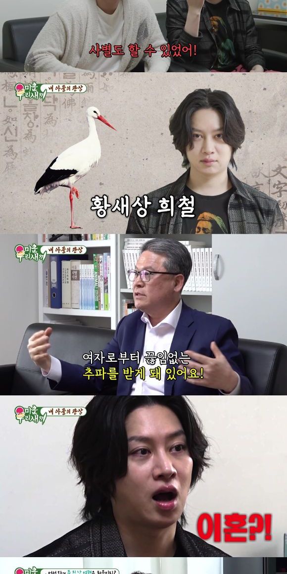 이어 김희철의 관상을 본 관상가는 "김희철은 3% 안에 들어가는 분"이라며 100%에 가까울 정도로 황새상이라고 전했다. 관상가는 "황새는 1급수처럼 깨끗한 데에서만 살고 농약에 취약하다. (깨끗한 집이) 여자하고 연결이 된다. 1급수처럼 깔끔하게 자기 영역을 만들어 놓으면 여성이 여기 왔을 때 숨을 못 쉰다. 본인이 힘든 게 아니라 여자가 힘들어진다"고 설명했고 장근석은 "그래서 들어왔다가 빨리 나가는구나"라고 너스레를 떨었다. 이어 관상가는 "김희철은 도화눈을 가지고 있다. 도화눈을 갖고 있기 때문에 눈 하나로 여자로부터 끊임없는 추파를 받게 돼있다. 수많은 여자들이 같이 데이트하고 싶은 욕망을 느낀다"며 "25살, 26살, 30살, 31살. 작년, 재작년에도 여자가 있었다"고 말해 김희철을 놀라게 했다. 그러나 결혼에 대해서는 "여자는 많은데 내 여자가 되는 건 다르다. 결혼할 좋은 여자는 49살, 50살은 돼야 그 여자가 결혼할 여자다. 일찍 결혼하면 100% 이혼한다"고 전해 김희철에게 충격을 안겼다.