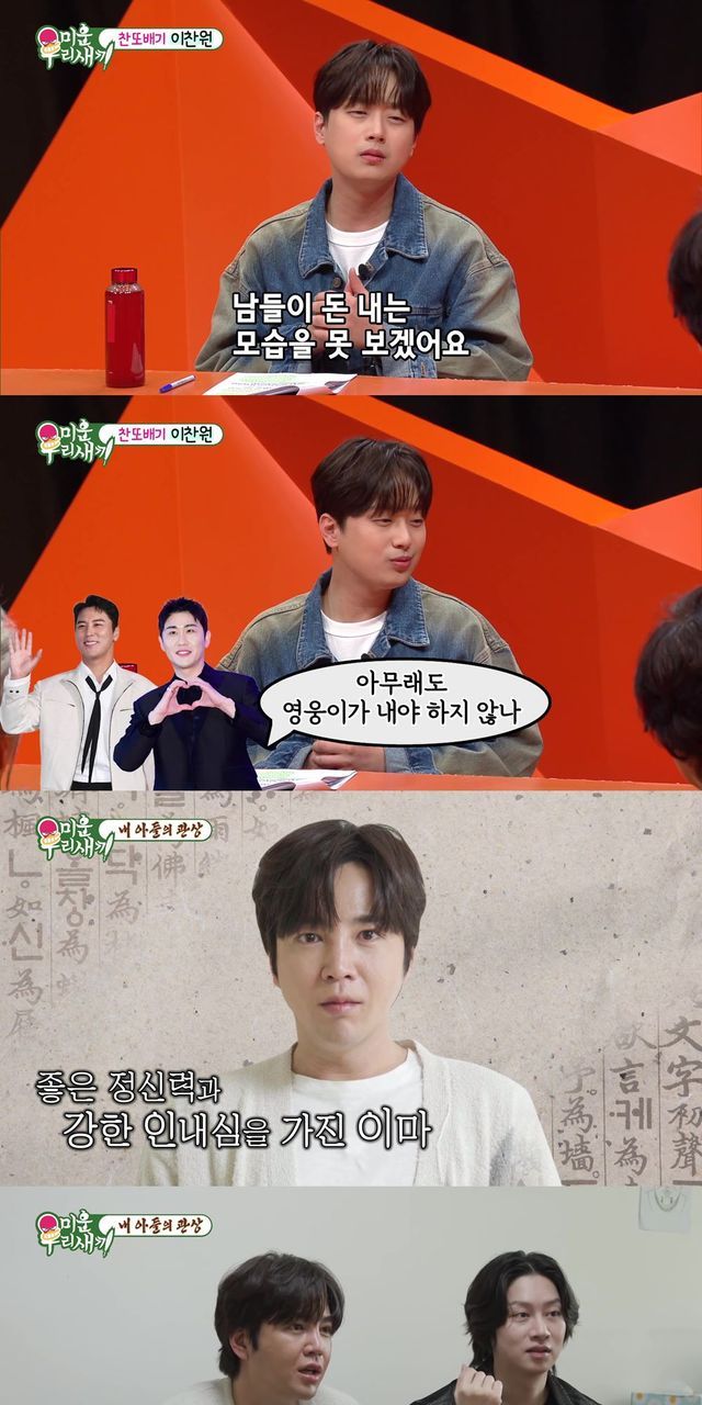 서장훈은 "이찬원이 김승수를 뛰어넘는 열린 지갑이다. 누가 계산하는 꼴을 못 본다고 한다"며 주변 사람들에게 사주느라 한 달 식비만 6~700만 원이 나오는 점을 언급했다. 이찬원은 "진짜 많이 나올 때는 그렇게 나온다"고 이를 인정했다. 패널들이 그에게 "임영웅, 영탁, 장민호와 같이 밥을 먹으면 누가 계산하냐"고 묻자 "네 명 다 본인이 계산하려고 싸운다. 그런데 결국은 장민호도 영탁도 임영웅이 내는 게 맞지 않냐고 한다. 번데기 앞에서 주름 잡는 격이 되는 셈이다"고 밝혀 웃음을 안겼다.