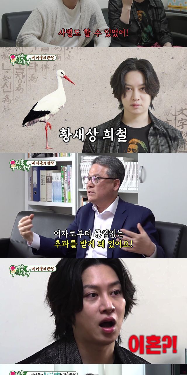 또한 김희철에 대해서는 "전체 인구 중 3%만이 가진 동물 관상"이라며 100%에 가까울 정도로 황새상이라고 언급했다. 관상가가 "황새는 1급수처럼 깨끗한 데에서만 살고 농약에 취약하다. (깨끗한 집이) 여자하고 연결이 된다. 1급수처럼 깔끔하게 자기 영역을 만들어 놓으면 여성이 여기 왔을 때 숨을 못 쉰다. 본인이 힘든 게 아니라 여자가 힘들어진다"고 하자 장근석은 "그래서 들어왔다가 빨리 나가는구나"라고 너스레를 떨었다. 이어 관상가는 "김희철은 도화눈을 가지고 있다. 눈 하나로 여자로부터 끊임없는 추파를 받는다"며 "25살, 26살, 30살, 31살. 작년, 재작년에도 여자가 있었다"고 해 김희철을 놀라게 만든다. 그러나 결혼에 대해서는 "여자는 많은데 내 여자가 되는 건 다르다. 49살, 50살은 돼서 만나야 결혼할 여자다. 일찍 결혼하면 100% 이혼한다"고 해 그에게 충격을 안겼다.