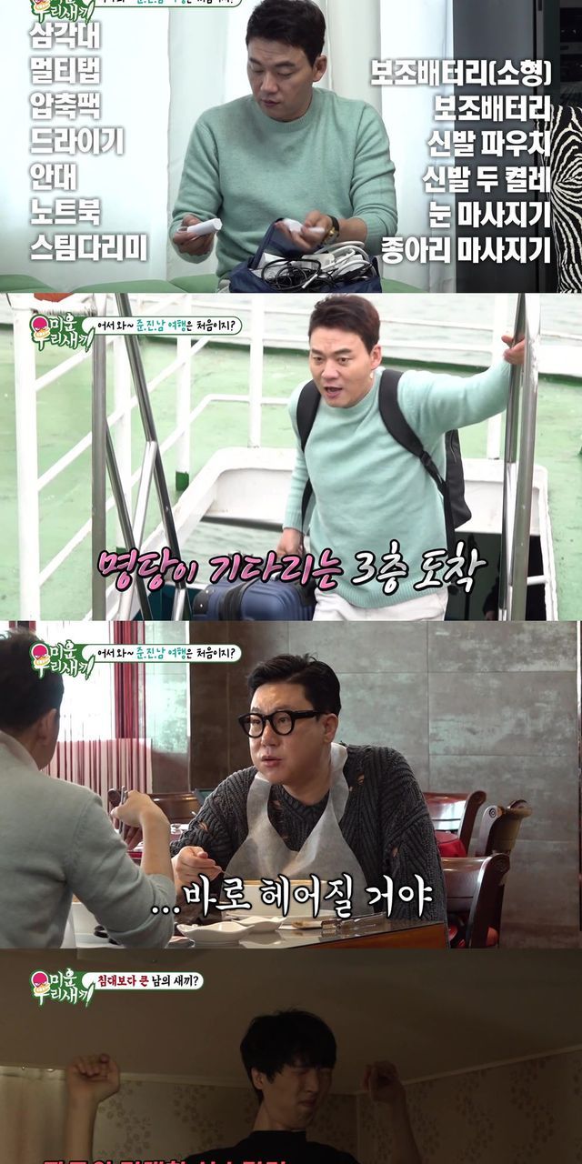 그런가 하면 이상민과 김승수는 이상민의 새로운 출발을 기념해 여행을 떠났다. 김승수는 여행에 앞서 시간대별로 촘촘하게 일정을 짜고, 커다란 캐리어를 챙기며 '파워 J'의 면모를 드러냈다. 식당에서조차 쉴 틈 없는 일정에 이상민은 "여자친구랑 이렇게 여행하면 이러면 안된다. 바로 헤어진다"고 '팩폭'을 날려 폭소를 유발했다.