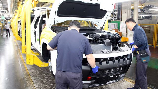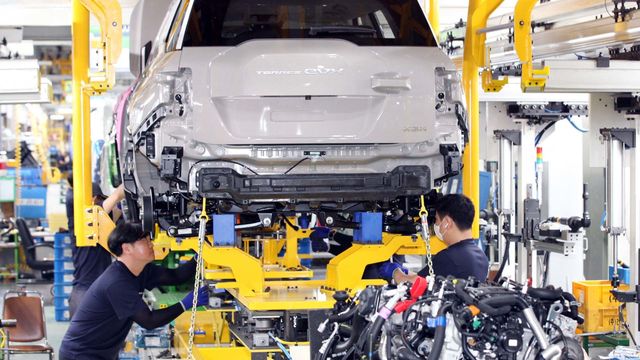 KG모빌리티 평택 공장 조립 라인에서 작업자들이 범퍼를 부착하고 있다. / KG모빌리티