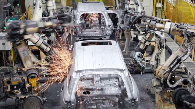KG 모빌리티 평택 공장 차체 라인에서 용접 로봇들이 차체를 용접하는 모습. / KG모빌리티