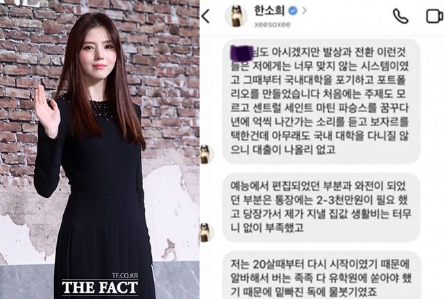 앞서 한소희는 올 1월 유튜브 채널 '십오야'의 '나영석의 나불나불'에 출연해 "프랑스 학교에 붙었었는데 못 갔다"고 밝힌 바 있다. 당시 한소희는 "제 명의로 된 통장에 6000만원이 있어야 비자가 발급되는데 그때 제가 6000만원이 어디 있었겠느냐"라며 합격했음에도 못 간 일화를 전했다.