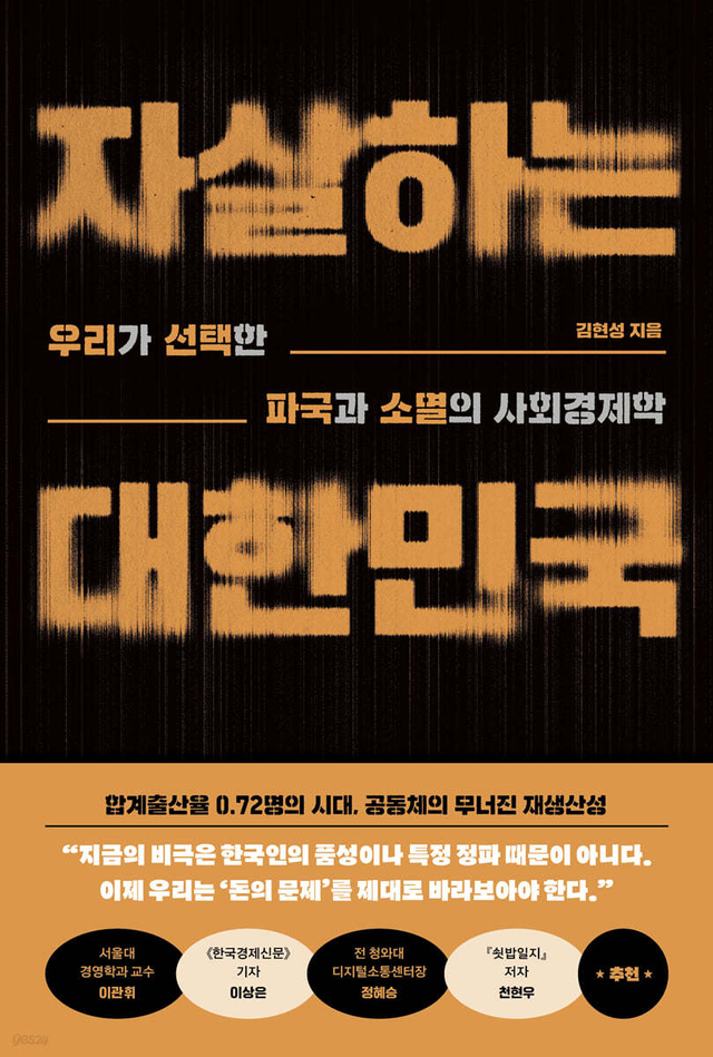 끝끝내 사람을 갈아서 굴러가는 나라, 재생산성이 붕괴한 나라, 혐오주의가 팽배한 내라, 시험과 공정에 집착하는 나라. 어쩌다 우리는 파국과 소멸의 길을 걸으며 ‘자살’을 택하게 되었는가? 대한민국을 사멸의 길로 이끄는 경제구조와 악순환의 고리를 철저하게 분석하지만, 냉소에 그치지 않고 끝내 희망을 발견하고자 하는 사회 분석서.