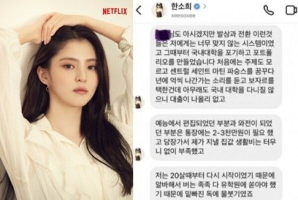 이어 한소희는 "아무래도 국내 대학을 다니질 않으니 대출이 나올 리 없었다. 예능에서 편집된 부분과 와전된 부분은 통장에 2000~3000만원이 필요했고, 당장 가서 제가 지낼 집값, 생활비는 터무니없이 부족했다"면서 "20살 때부터 다시 시작이었기 때문에 아르바트 해서 버는 족족 다 유학원에 쏟아야 했기 때문에 밑 빠진 독에 물 붓기였다"고 말했다.