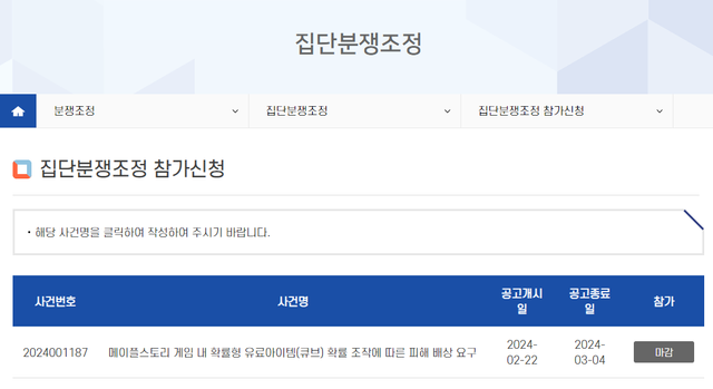 ▲ 지난 2월에 접수를 시작한 메이플스토리 피해 배상 요구 집단분쟁조정 (자료출처: 한국소비자원 공식 홈페이지)
