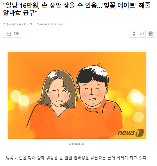 그는 4월 6일~7일 중 하루, 서울 한강 및 여의도 일대에서 벚꽃 데이트를 할 여성 아르바이트생을 구했다.