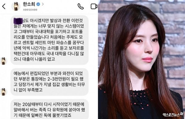 한 누리꾼은 이에 대해 한소희에게 DM을 통해 직접 물었고, 한소희는 "발상과 전환 이런 것들은 저에게는 너무 맞지 않는 시스템이었고 그때부터 국내대학을 포기하고 포트폴리오를 만들었다"고 이야기했다.
