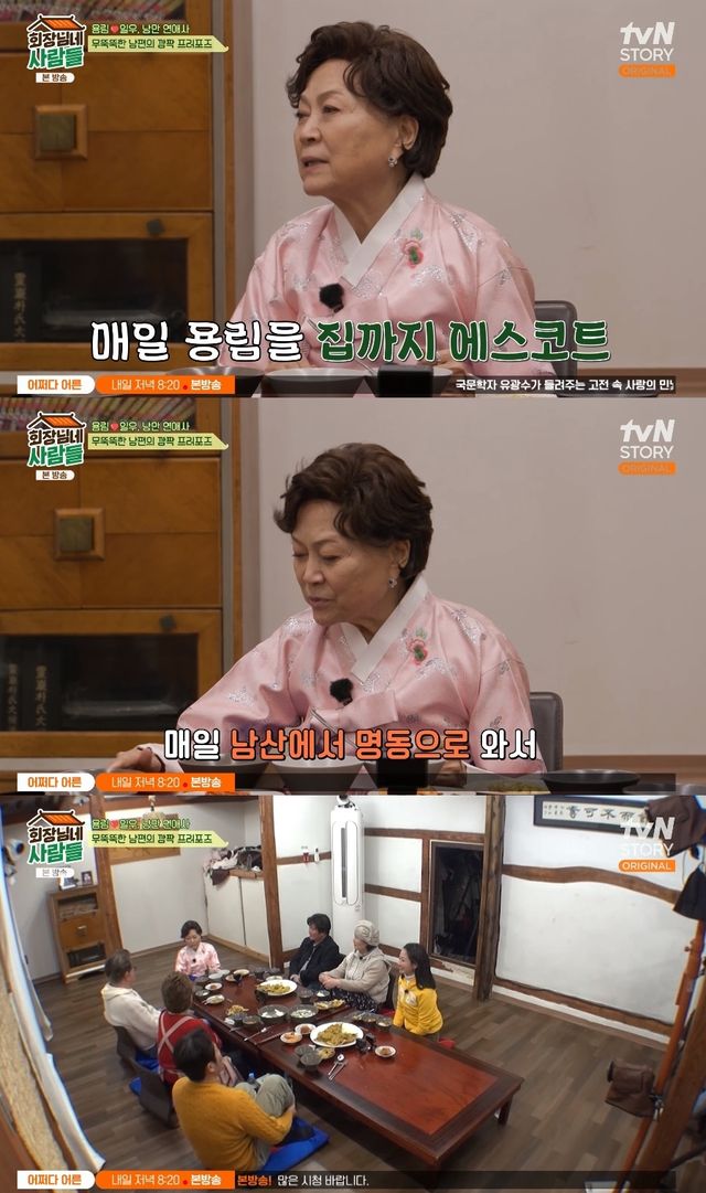 그는 "남편이 꽃을 사 준다거나 하는 건 없다. 그런데 매일 남산에서 명동까지 내려와서 나를 집에 데려다 줬다. 하루도 안 빠지고"라며 무뚝뚝하지만 다정했던 남일우만의 사랑 표현 방식을 전했다.