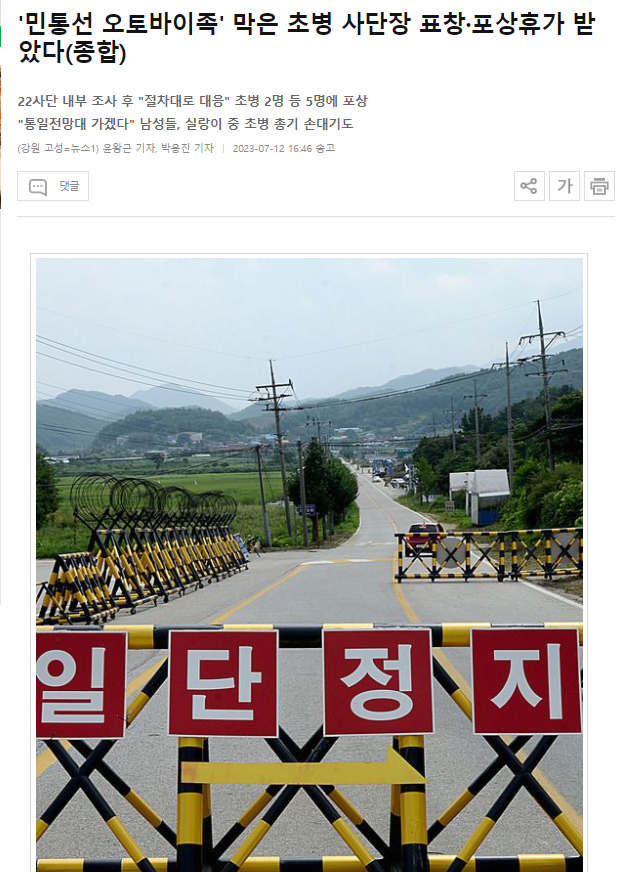 12일 육군 3군단 등에 따르면 오토바이를 타고 민통선으로 무단진입 하려는 남성 일행을 저지한