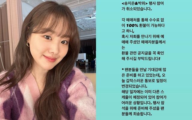 아쉬운 소식을 전한 송지은은 행사를 기다렸던 팬들에게 “각 예매처를 통해 수수료 없이 100% 환불이 가능하다고 하니, 혹시 저희를 만나기 위해 (티켓을) 예매하신 분들은 환불 관련 공지글을 꼭 확인해 주시길 부탁드린다”며 공지했다.