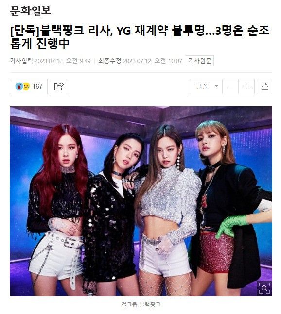 문화일보의 취재를 종합하면, 리사와의 협상과는 별개로 YG는 블랙핑크 나머지 멤버 3명과의 재계약 과정은 비교적 순조롭게 진행하고 있다. “서로의 입장차를 좁혀가며 재계약 후 동행하는 것으로 방향을 잡았다”고 업계 관계자는 전했다.