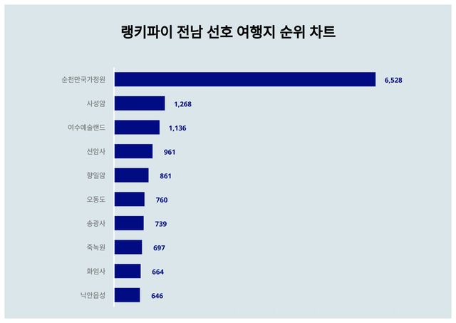 랭키파이가 빅데이터로 분석한 결과에 따르면 순천만국가정원이 1위로 선두를 달리고 있다. 뒤를 이어 2위 사성암, 3위 여수예술랜드로 나타났다.