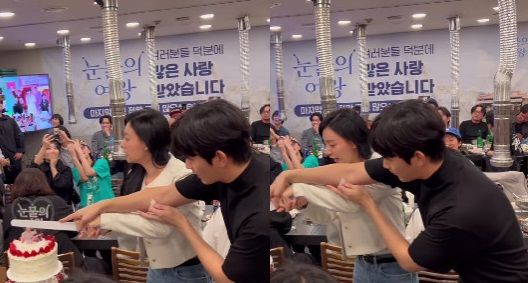 종방연에서 김수현과 김지원은 '눈물의 여왕' 마무리를 기념하기 위해 함께 케이크를 잘라 훈훈함을 안긴다.