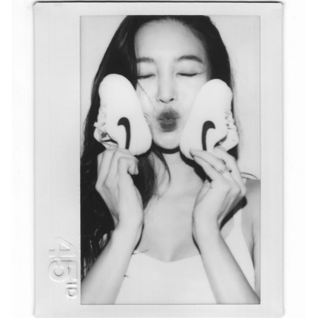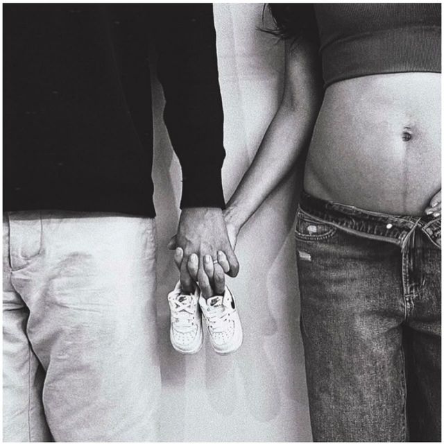 사진 속 김윤지는 남편 최우성과 손을 잡고 아기 신발을 든 채 포즈를 취하고 있다.
