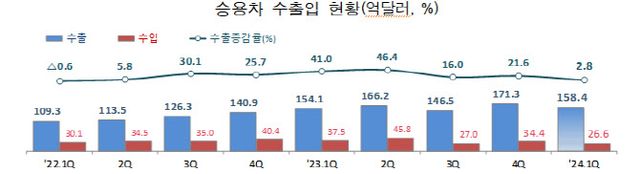지난 1분기 한국 신차 수출액이 158억달러로 지난해 같은 기간보다 2.8% 증가하며 역대 최대치를 기록한 것으로 집계됐다. 2022년 1분기 이후 8분기 연속 증가세다.