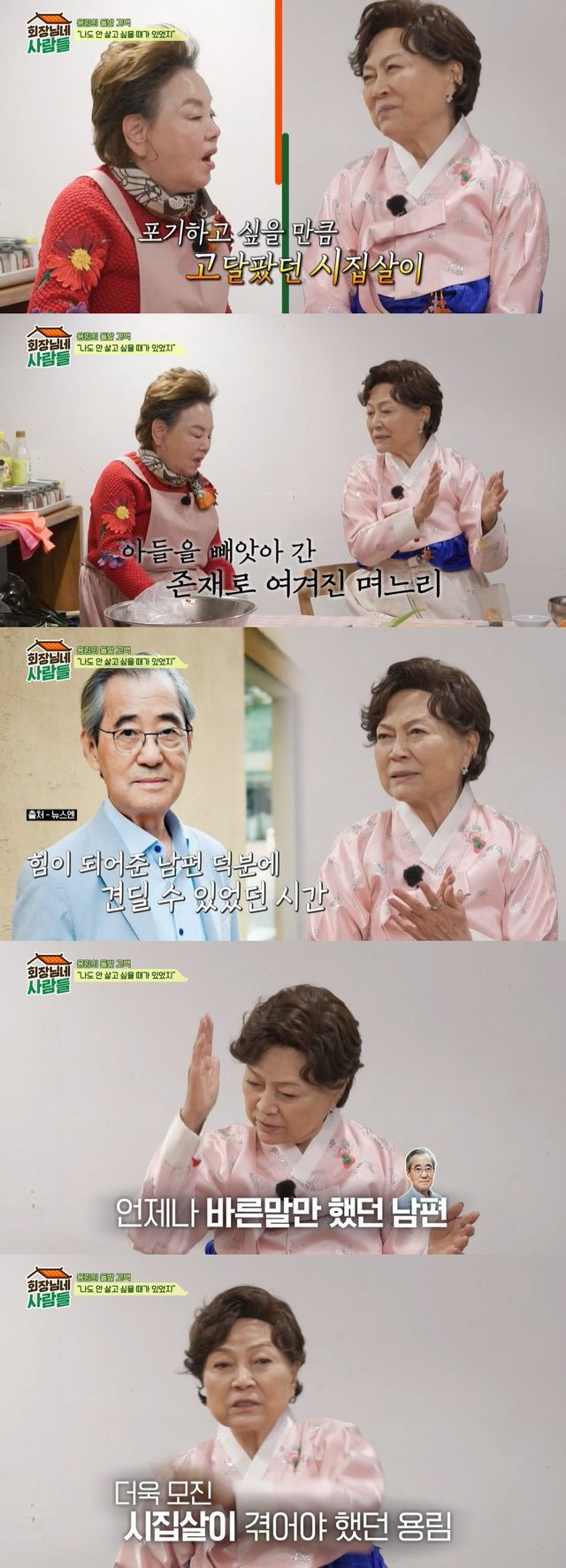 김용림은 이어 "남일우 씨가 외박 한 번 해본 적이 없다더라. 그래서 내가 깨달았다. 내가 며느리에 대한 불만을 계속 얘기하면 결국 내 아들이 힘들겠구나. 그러니까 그럴 필요가 없다. 며느리도 그냥 내 딸이라고 생각하고 절대 내가 시집살이는 안 시킨다"라며 신념을 드러냈다.