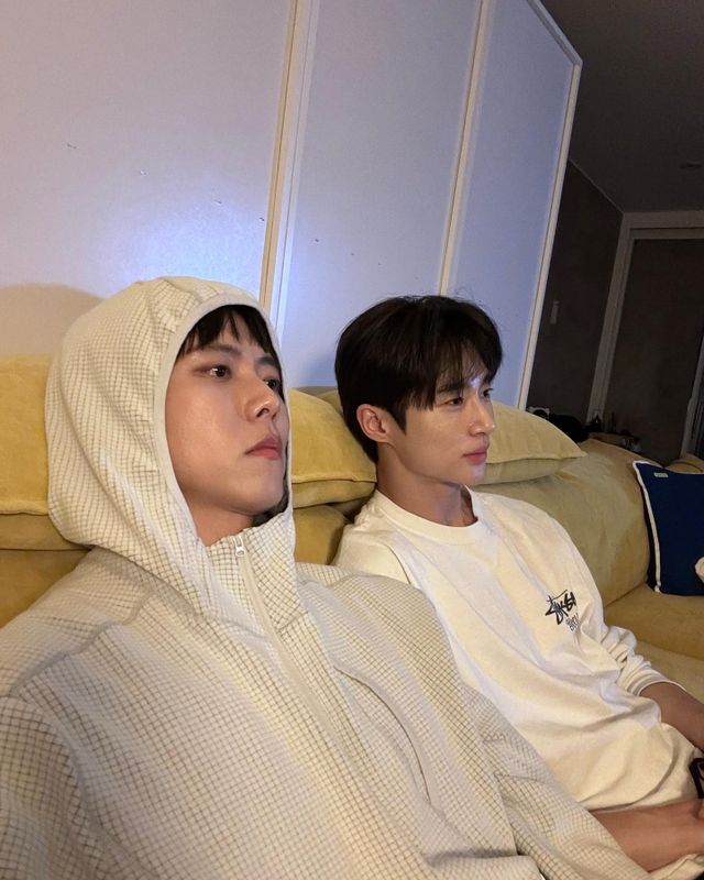 사진 속 변우석과 주우재는 '선재 업고 튀어'를 유심히 시청하다 손으로 입을 막고 놀란 표정을 짓고 있다.