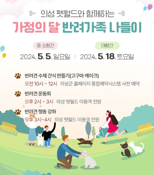 [파이낸셜경제=김영란 기자] 의성군은 의성 펫월드에서 가정의 달을 맞이하여 5월 5일과 18일, 2회로 나눠 가족 구성원인 반려견과 함께 즐길 수 있는 체험형 프로그램 및 강좌를 진행한다고 밝혔다.