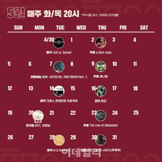 이번 온라인 중계로 선보이는 작품은 연극 ‘화전’, 뮤지컬 ‘여기, 피화당’, 무용 ‘어 다크 룸’(a Dark room), 음악 ‘인 & 어라운드 씨’(In & Around C), 오페라 ‘이상의 날개’, 전통예술 ‘밤쩌: 사라져가는 것에 대하여 파트2’ 등 11편이다.