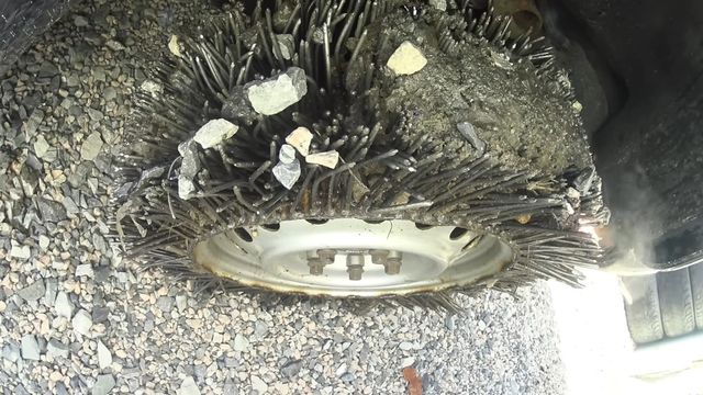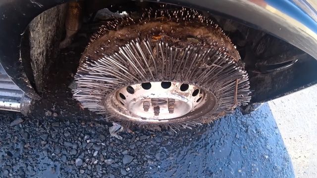 따라서 못이 도로에 닿는 순간 이런 실험은 모두 끝났다. 강철 와이어는 자동차 무게(공차중량 2.5톤)에 눌려 휘고 비틀리며 땅에 구멍을 뚫고 박혔다.