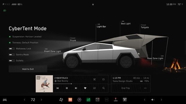 사이버트럭은 미끄러운 지면에서도 더 나은 성능을 발휘하며, 사이버텐트(CyberTent) 모드는 서스펜션의 높이를 조절해 울퉁불퉁한 지면에서도 반듯하게 취침할 수 있다.