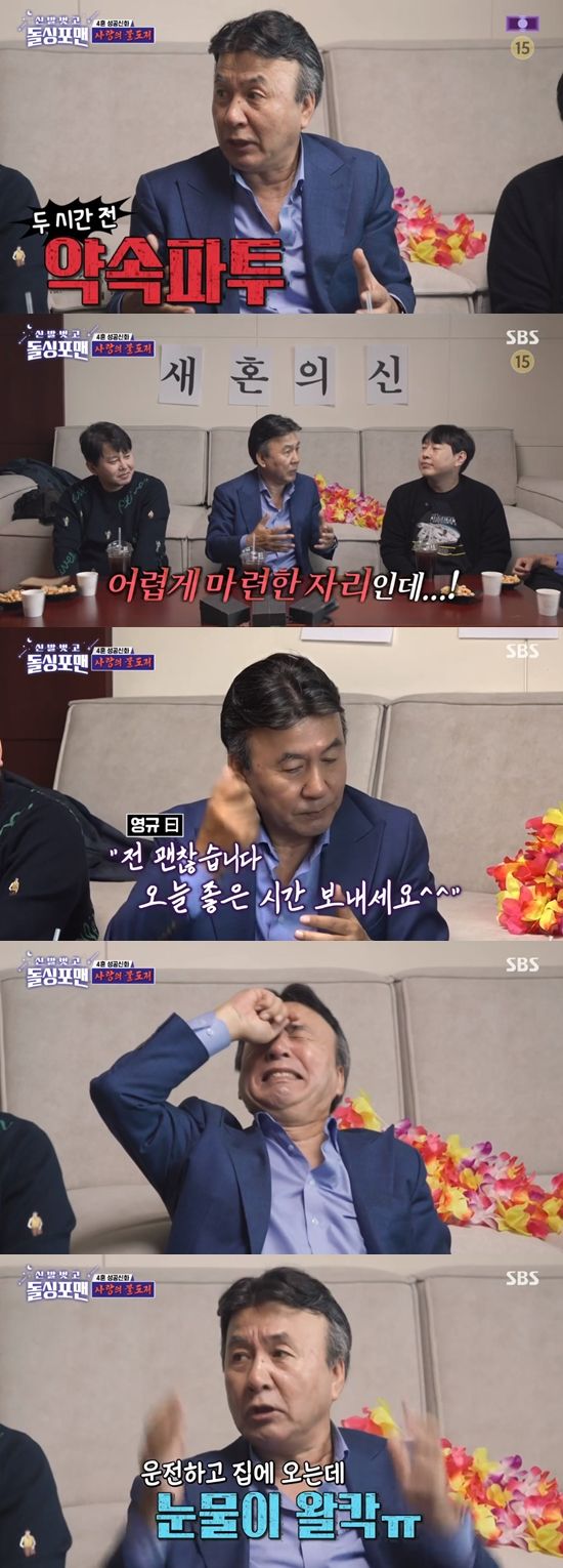 박영규는 "약속을 잡으면 만나기 두 시간 전에 못 나가겠다고 파투를 냈다. 이런 경우는 처음 경험했다. 운전하고 집에 오는데 눈물이 쏟아지더라"고 회상했다.