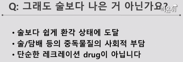 유투브에서 정신건강의학과 교수님은 4가지 이유를 통해 대마가 담배, 술에 비해 더 위험한 약물이라고 설명함.