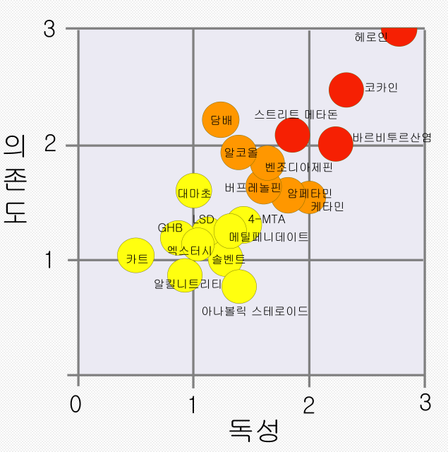 담배 술에 비해 대마가 더 낮은 의존도와 독성을 보여준다는 그래프이다.